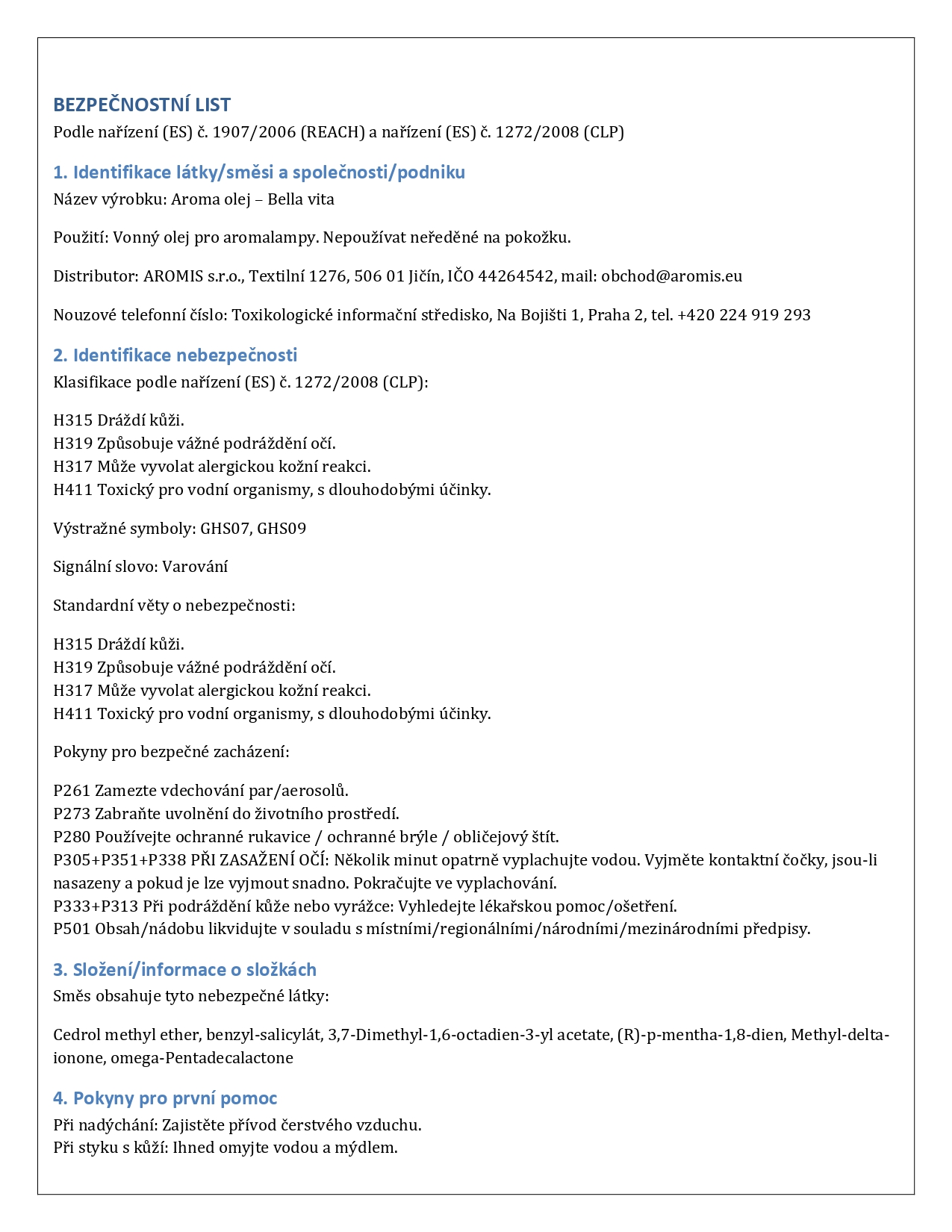 Bella Vita - Bezpečnostní list