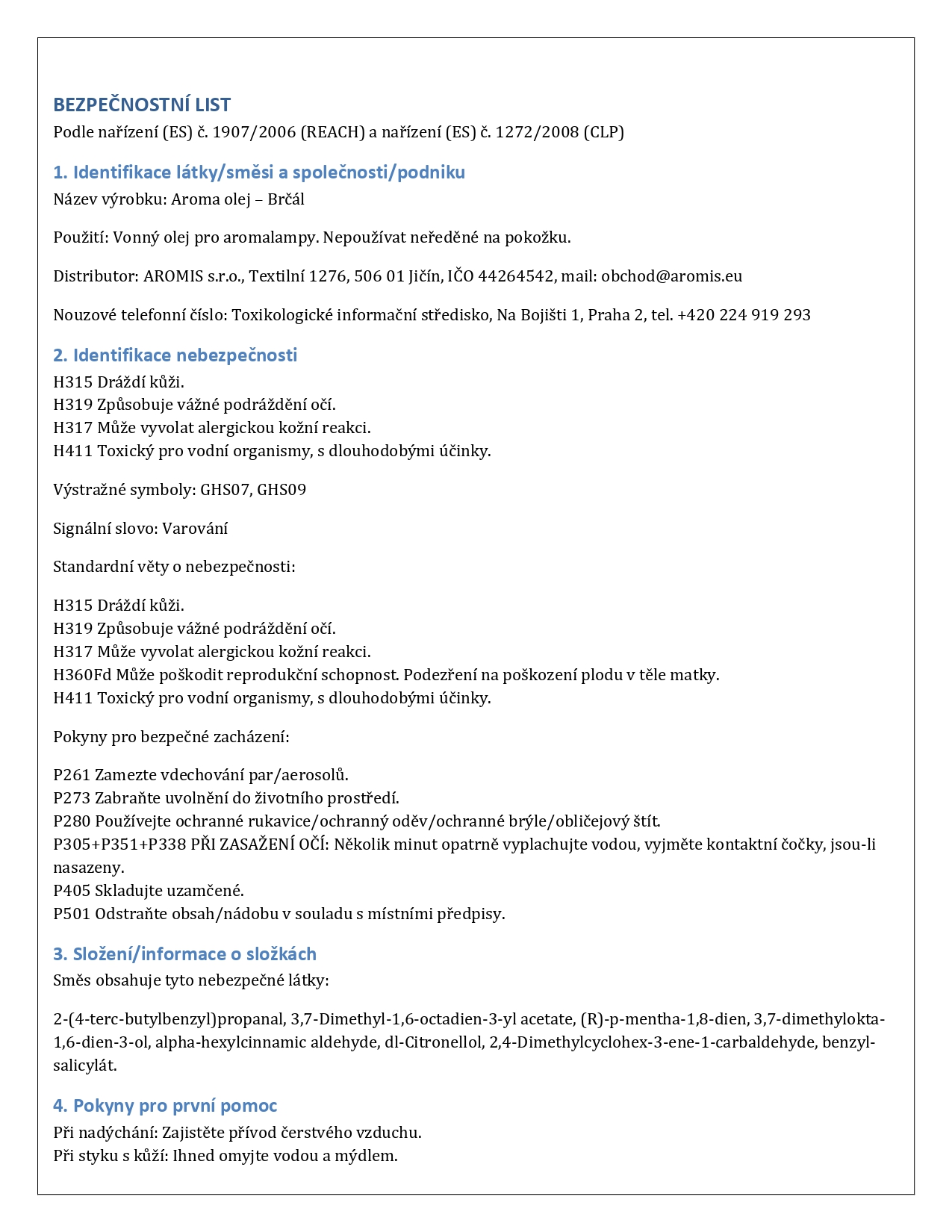 Některé uvedené složky jsou přirozeně se vyskytující v rostlinách (např. terpeny, aldehydy, alkoholy apod.) a jejich uvedení v seznamu nebezpečných látek vychází z legislativních požadavků dle nařízení CLP a nemusí to znamenat, že by výrobek obsahoval škodlivé nebo umělé chemikálie.