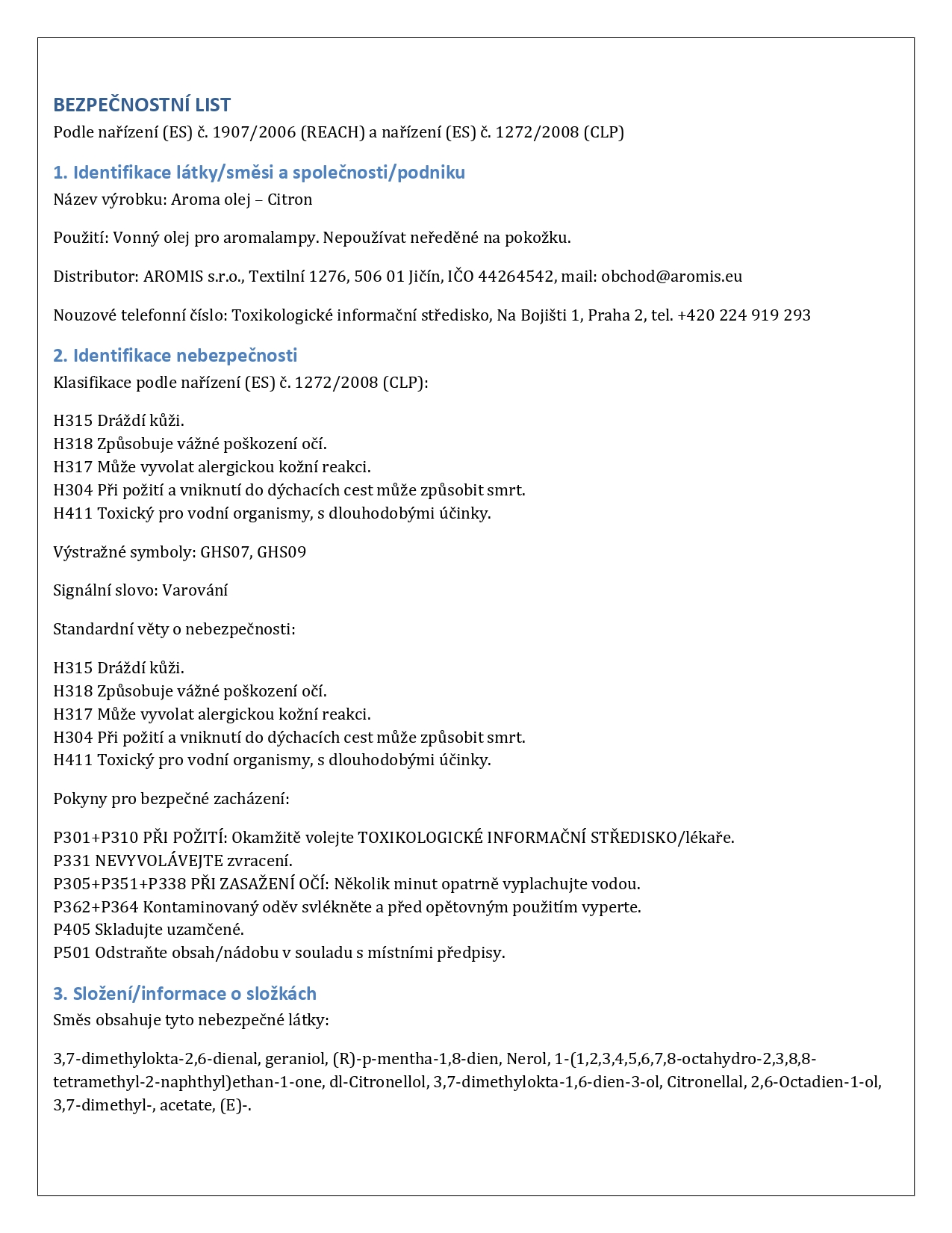 Některé uvedené složky jsou přirozeně se vyskytující v rostlinách (např. terpeny, aldehydy, alkoholy apod.) a jejich uvedení v seznamu nebezpečných látek vychází z legislativních požadavků dle nařízení CLP a nemusí to znamenat, že by výrobek obsahoval škodlivé nebo umělé chemikálie.