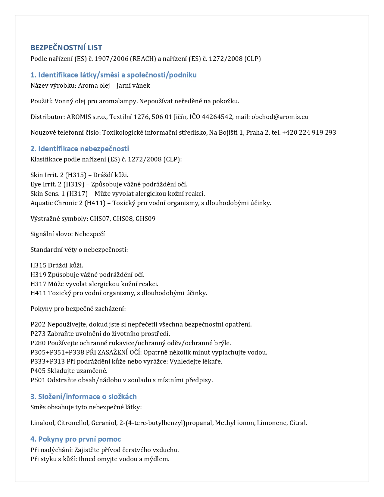 Některé uvedené složky jsou přirozeně se vyskytující v rostlinách (např. terpeny, aldehydy, alkoholy apod.) a jejich uvedení v seznamu nebezpečných látek vychází z legislativních požadavků dle nařízení CLP a nemusí to znamenat, že by výrobek obsahoval škodlivé nebo umělé chemikálie.