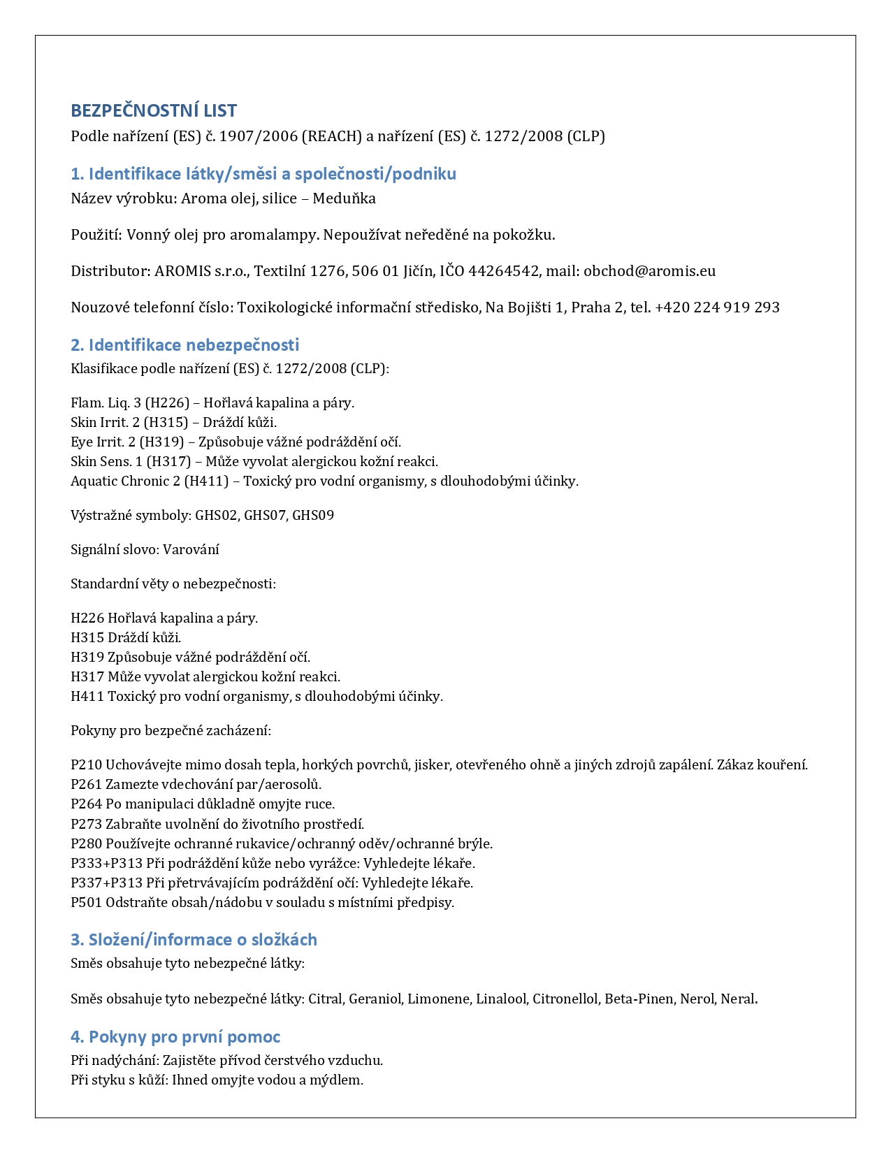 Meduňka - Bezpečnostní list