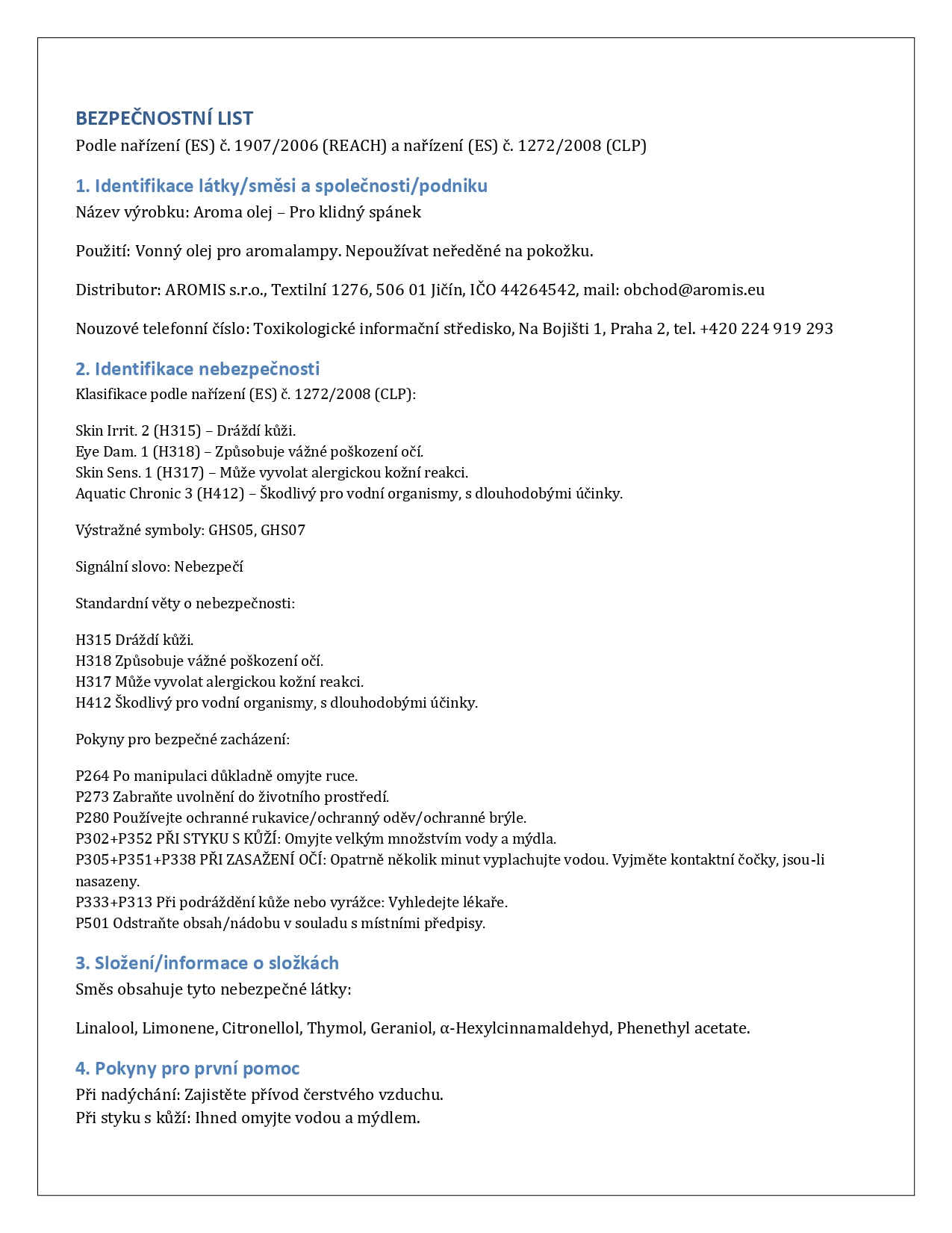 Některé uvedené složky jsou přirozeně se vyskytující v rostlinách (např. terpeny, aldehydy, alkoholy apod.) a jejich uvedení v seznamu nebezpečných látek vychází z legislativních požadavků dle nařízení CLP a nemusí to znamenat, že by výrobek obsahoval škodlivé nebo umělé chemikálie.