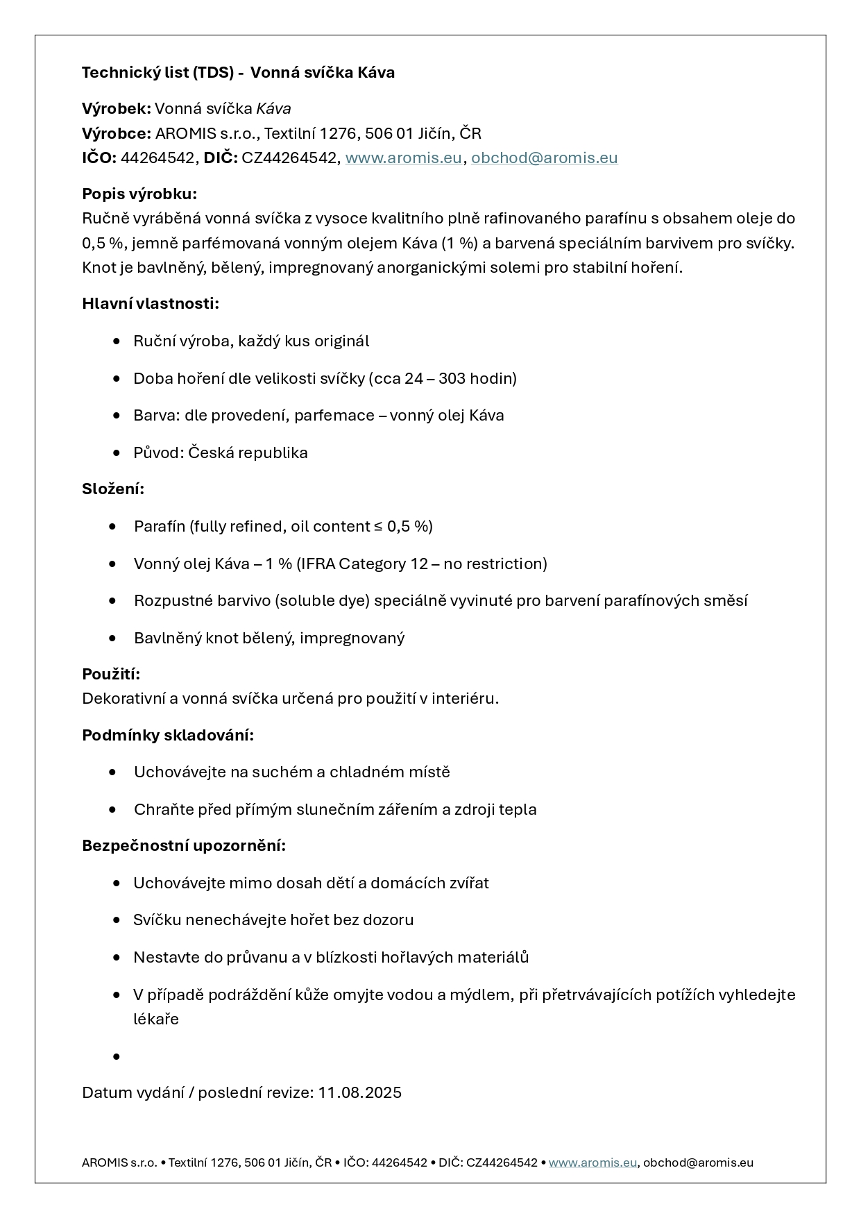 Výrobce: AROMIS s.r.o., Textilní 1276, 506 01 Jičín, ČR, IČO 44264542, www.aromis.eu, e-mail: obchod@aromis.eu, Země původu: vyrobeno v České republice. Svíčka je vyrobena z vysoce kvalitního parafínu s obsahem oleje do 0,5% + vonný olej, knot je bavlněný a je bezpečný pro zdraví lidí i pro životní prostředí. Uchovávejte mimo dosah dětí. Při podráždění kůže nebo vyrážce: Vyhledejte lékařskou pomoc. Zabraňte uvolnění do životního prostředí. Nestavte do průvanu nebo v blízkosti hořlavých materiálů. Neponechávejte svíčku hořet bez dozoru.