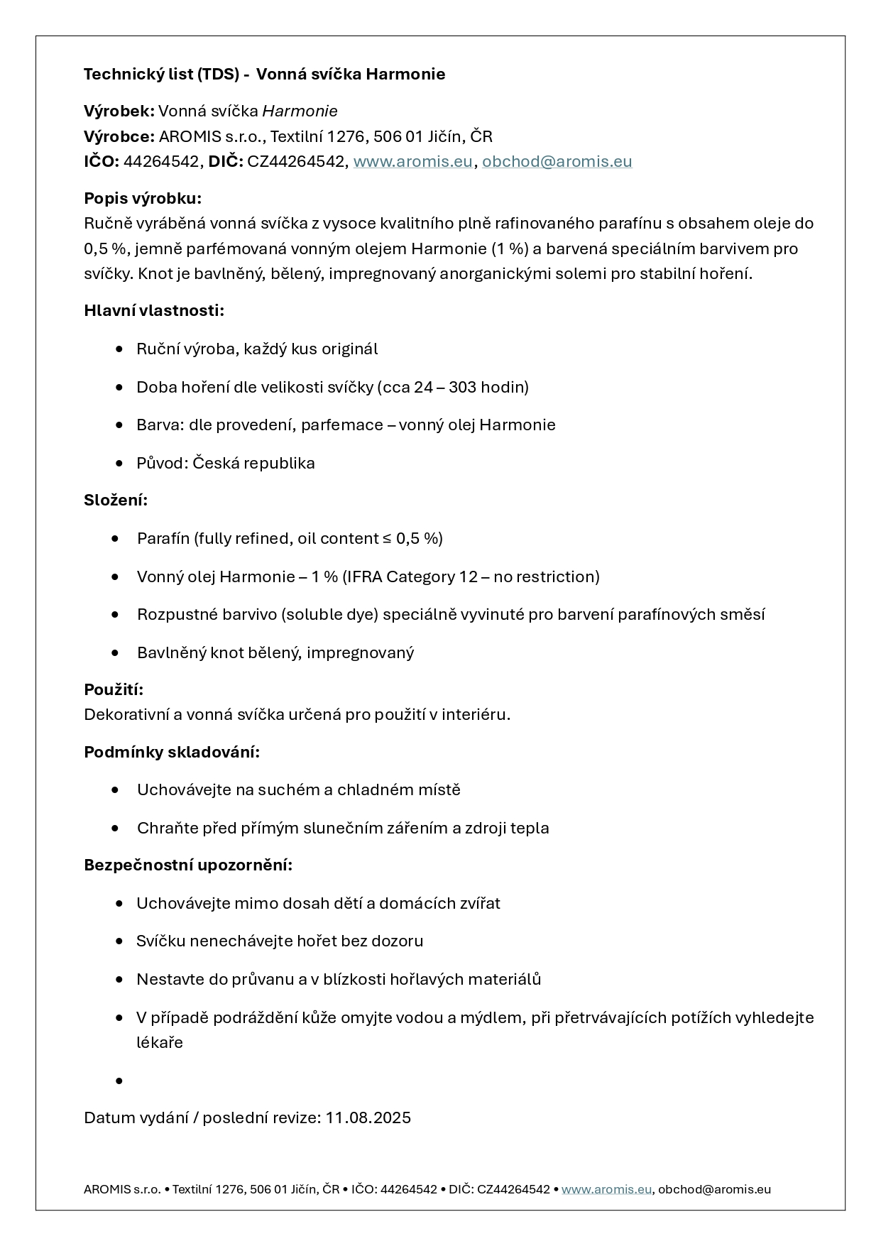 Výrobce: AROMIS s.r.o., Textilní 1276, 506 01 Jičín, ČR, IČO 44264542, www.aromis.eu, e-mail: obchod@aromis.eu, Země původu: vyrobeno v České republice. Svíčka je vyrobena z vysoce kvalitního parafínu s obsahem oleje do 0,5% + vonný olej, knot je bavlněný a je bezpečný pro zdraví lidí i pro životní prostředí. Uchovávejte mimo dosah dětí. Při podráždění kůže nebo vyrážce: Vyhledejte lékařskou pomoc. Zabraňte uvolnění do životního prostředí. Nestavte do průvanu nebo v blízkosti hořlavých materiálů. Neponechávejte svíčku hořet bez dozoru.
