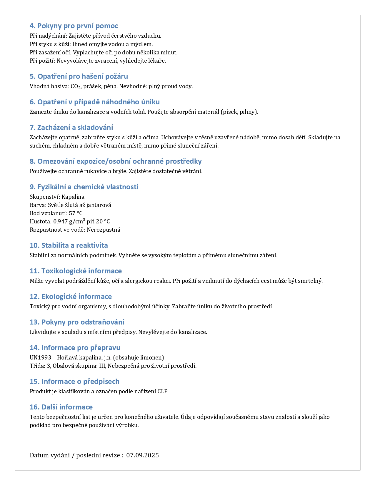Všechny naše produkty mají řádné bezpečnostní listy (SDS), dodržujeme evropskou legislativu REACH a CLP a všechny informace o bezpečném používání uvádíme transparentně.